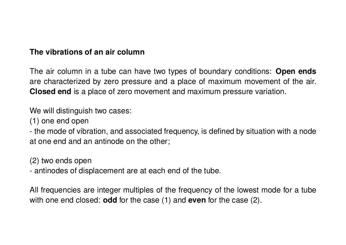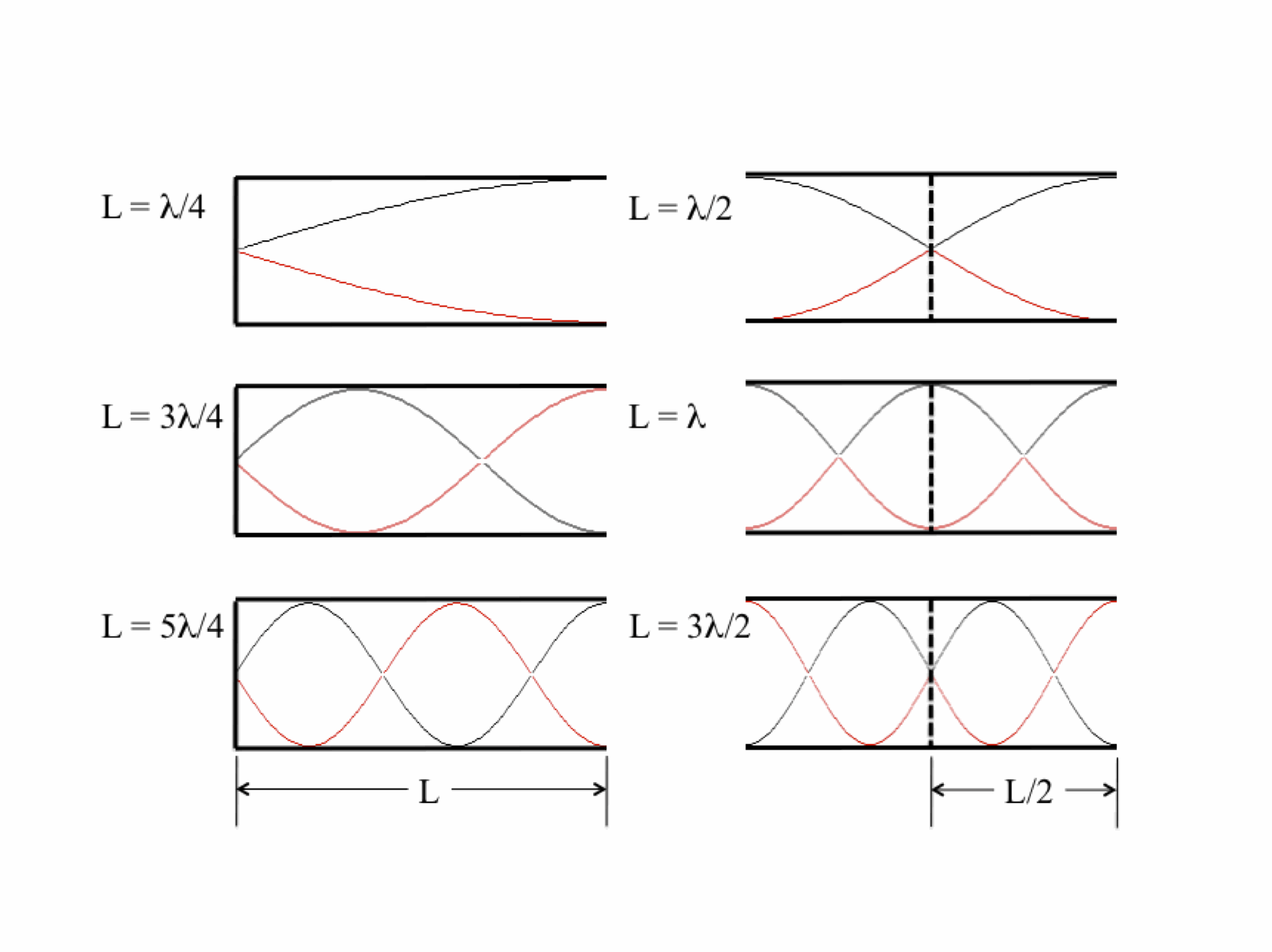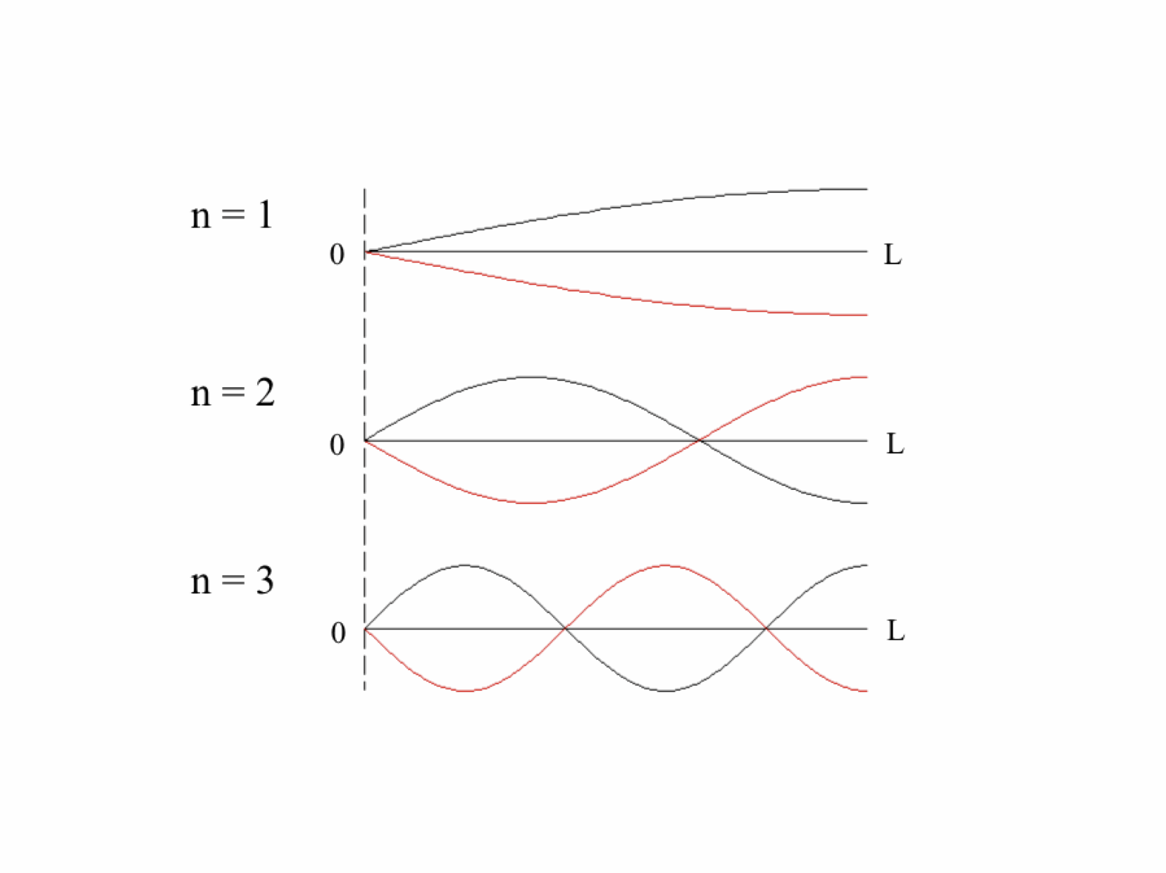 The normal modes of vibration of a column of gas -- say, the air within a tube -- depend on the boundary conditions, namely, whether or not the ends of the tube are open or sealed. The three animations below show the three lowest modes inside a tube with both ends closed, standing waves whose endpoints are fixed: