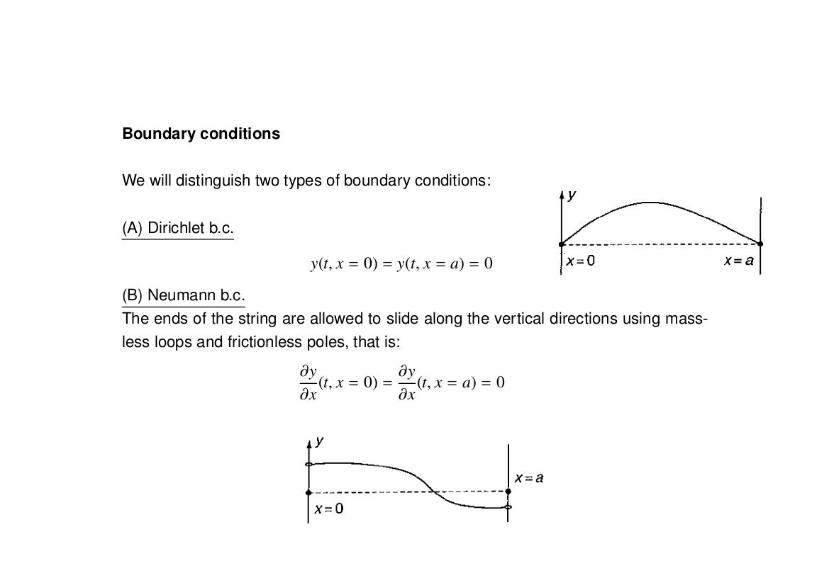 The left animation is a string with its ends held at fixed points; such a string is a Dirichlet string. The right animation, a Neumann string, has endpoints that can move freely, but the slope of the string at these points is fixed (note that the ends of the Neumann string are always perpendicular to the bounding lines).